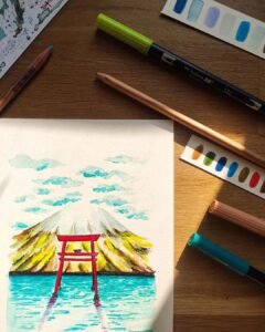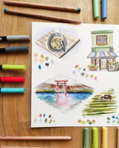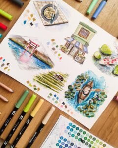 Réalisation de 6 illustrations originales sur le thème du Japon pour mettre en avant le matériel Tombow, dans le cadre d’un projet créatif filmé.